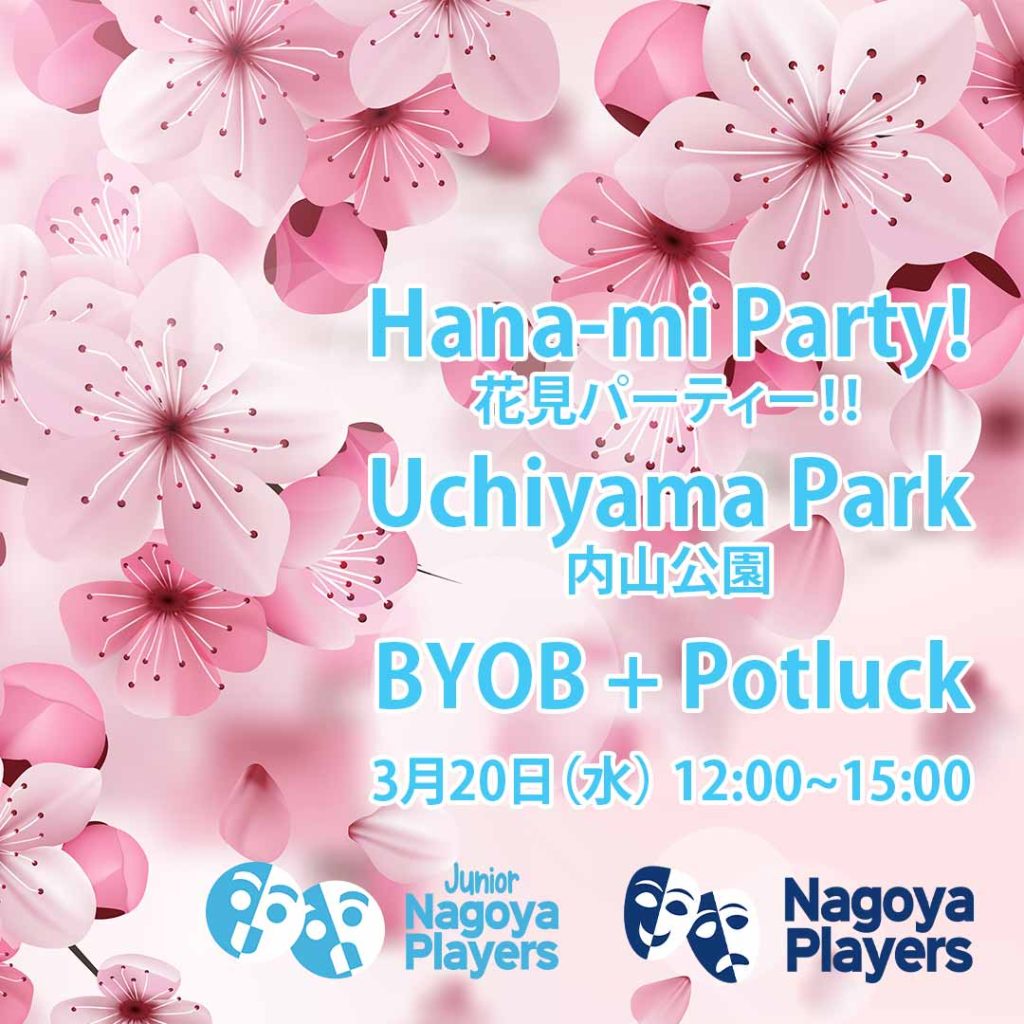Potluck Hana-mi party with the Nagoya Players cast, crew, audience, friends, past and present. All are welcome! Let’s eat, drink and talk about theater under the cherry blossom trees!