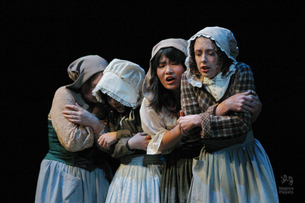 Although getting the casting right for the Proctors was essential to this production, they alone did not make this show memorable. The other cast members did a fantastic job. Michael Kruse as Reverend Hale and Brad Powers as Proctor’s adversary, Danforth, created a dynamic trio in the scene where John Proctor tears up the letter, and the tension in this scene was palpable. Prisca Molotsi did a fantastic job performing the role of Tituba in her debut for the Nagoya Players. Prisca also choreographed the opening dance scene, which shows Tituba leading Abigail and the other girls into a moonlight dance in the woods, which Abigail would later use to accuse Tituba and others of participating in witchcraft. This opening scene was not in the script, but, like the movie version with Winona Ryder and Daniel Day-Lewis, I added this scene because I wanted the mostly non-native English-speaking audience to have a visual understanding of Abigail’s accusations of witchcraft.