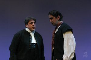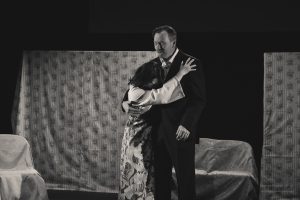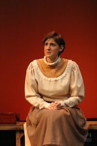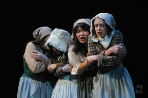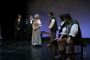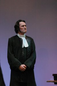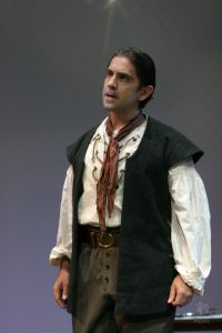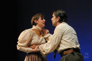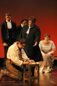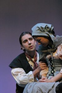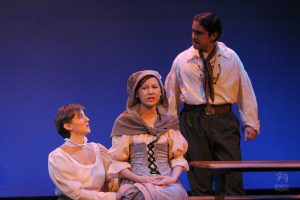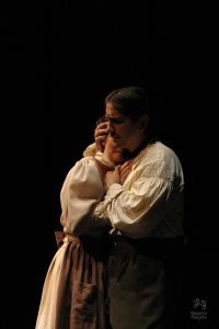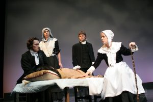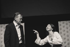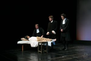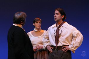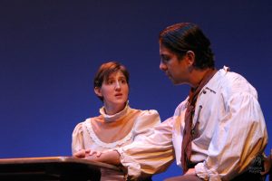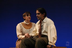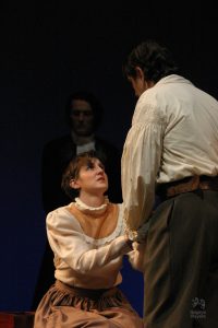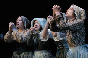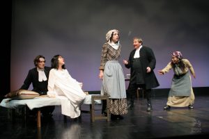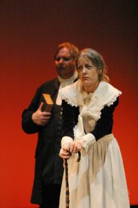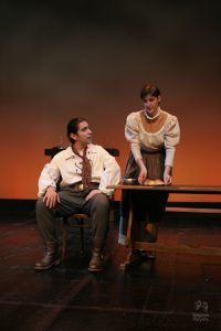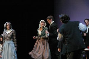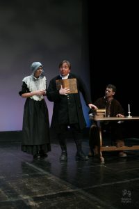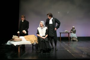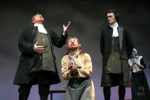 Going into auditions, I thought I had an idea of who I would cast for the roles of Elizabeth and John Proctor; after all, our group was small, and I needed to know when I decided to direct this play whether or not I had the right actors to cast this show. I was unexpectedly surprised by Rachel Gollin’s reading of Elizabeth on the day of the auditions. I had only known Rachel as a theater techy; I had no idea she could act. When she read the part of Elizabeth, she had a sincerity about her, a quietness that also encompassed strength, and these were the elements I thought were essential for Elizabeth Proctor. This was one of my best decisions regarding this play because her performance was touching, and her connection to John Proctor (played by Dan Lesho) was genuine and honest. As for casting Dan as John Proctor, that, too, was a wise decision. Through Dan’s interpretation of this character, I could see the complexity of John Proctor, a man flawed by his affair with Abigail Williams (played by Andrea Penny) but also courageous to stand up against his accusers. I’ll never forget the rehearsal when Dan’s performance brought me to tears, so much so that I had to leave the rehearsal space to deal with my overwhelming emotions. But I was not the only one moved by Dan’s performance. One of the performance nights, as John Proctor went to tear up the letter that could have saved his life, an audience member yelled out, “No! Don’t do it!” In all my years of theater experience, I have never heard an audience member speak out like this, but I could understand why they did it. Dan’s Proctor was relatable and vulnerable and had a sincere kindness that the audience could root for. We wanted John Proctor to live; he deserved to live.