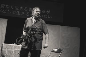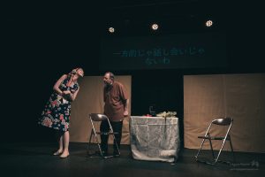 「砂場」は示唆に富んだ深いストーリーでした。人は老いて死にゆく事をテーマに家族の葛藤を描いています。GRANDMA(山本あつみ)の力強い演技とMOMMY(原エリカ)YOUNG MAN(津田しんすけ)MUSICIAN(ジョー •シチ)の4名が登場。この話では多くの老人が経験するであろう社会での立ち位置、孤立、孤独感について語っています。オールビーは鋭く機知に富んだ表現で老いと死の現実を描き、この現実からは程遠いであろう現役世代の私たちに警告を促しています。GRANDMAとYOUNG MANの会話は滑稽で心温まる一方、恐怖と心揺さぶる不条理であることを認めざるを得ません。ショッキングなエンディングに少なからず多くの方々が驚いたことでしょう。