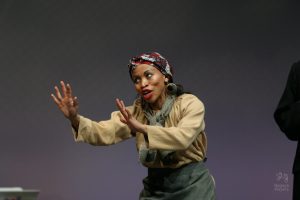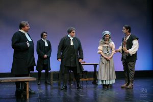Although getting the casting right for the Proctors was essential to this production, they alone did not make this show memorable. The other cast members did a fantastic job. Michael Kruse as Reverend Hale and Brad Powers as Proctor’s adversary, Danforth, created a dynamic trio in the scene where John Proctor tears up the letter, and the tension in this scene was palpable. Prisca Molotsi did a fantastic job performing the role of Tituba in her debut for the Nagoya Players. Prisca also choreographed the opening dance scene, which shows Tituba leading Abigail and the other girls into a moonlight dance in the woods, which Abigail would later use to accuse Tituba and others of participating in witchcraft. This opening scene was not in the script, but, like the movie version with Winona Ryder and Daniel Day-Lewis, I added this scene because I wanted the mostly non-native English-speaking audience to have a visual understanding of Abigail’s accusations of witchcraft.